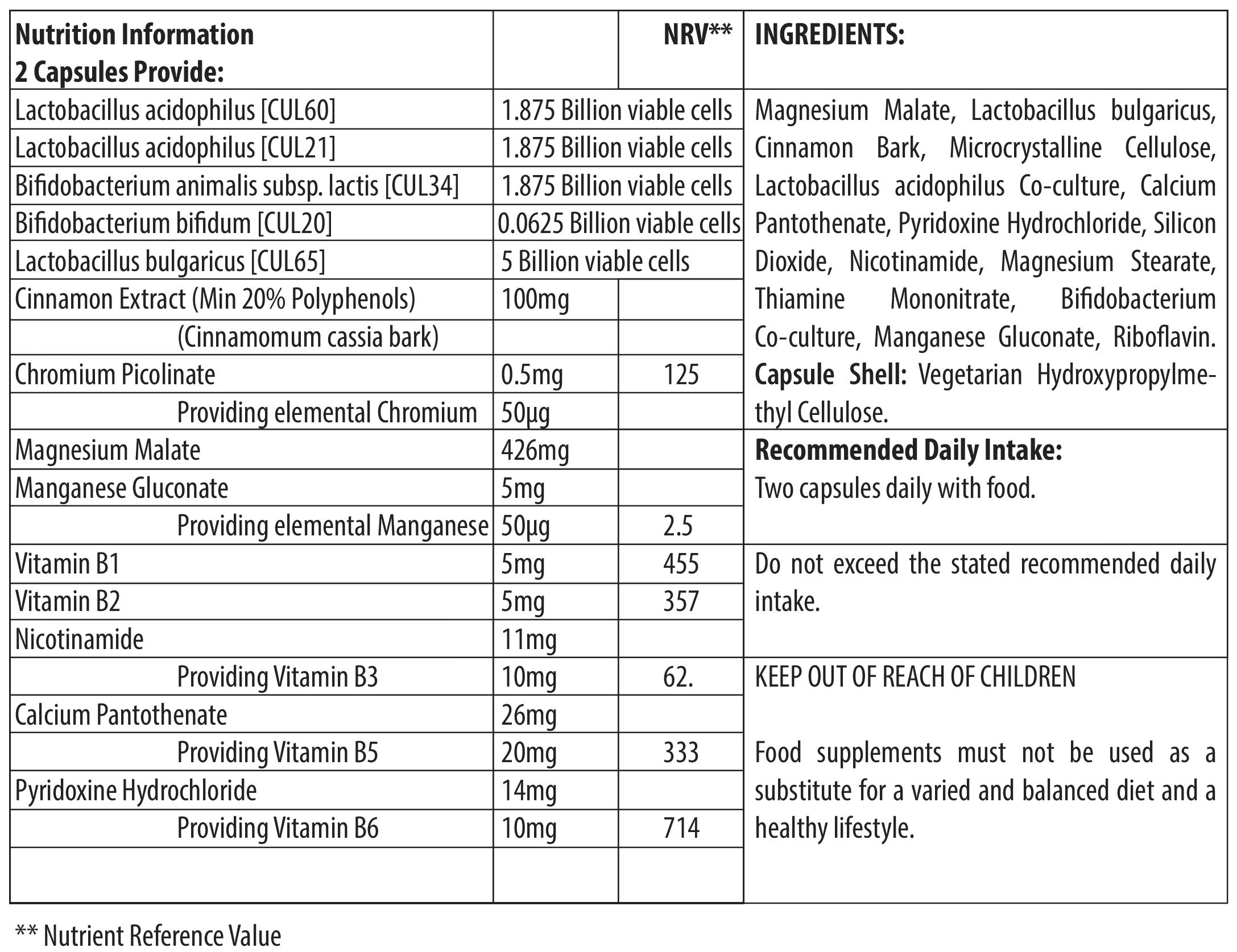 دعم الجلوكوز الغذائي من الكروم والمنجنيز وفيتامينات ب والقرفة مع الثقافات الحيوية الحية