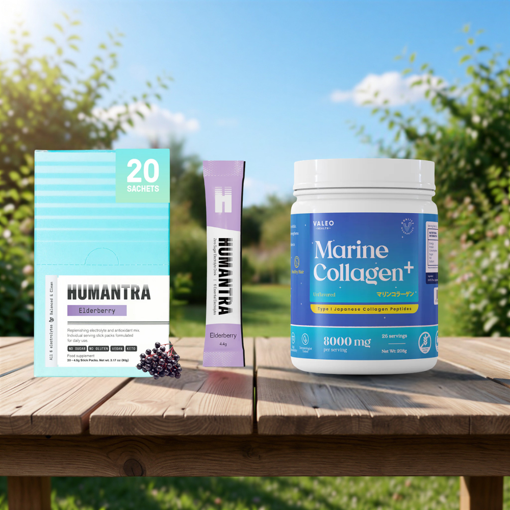 حسّن صحتك وترطيبك مع الثنائي المثالي: هيومانترا إلكتروليت بنكهة البلسان (90 غرامًا) وكولاجين فاليو البحري . يدعم هذا المزيج القوي ترطيبًا مثاليًا، وصحة مناعية، ونضارة البشرة والشعر والمفاصل، مما يجعله مثاليًا لأسلوب حياة نشيط يركز على الصحة والعافية.