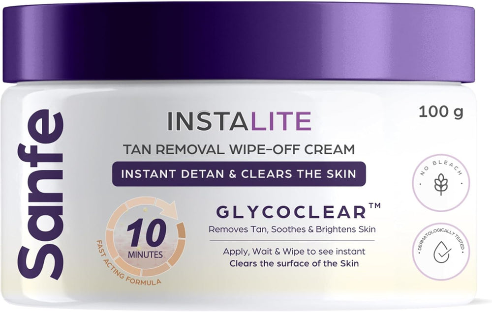 Sanfe Instalite Detan Wipe-Off Cream is a quick-action de-tanning formula designed to remove tan, brighten the skin, and restore natural radiance. Enriched with skin-friendly actives and botanicals, it gently clears dead skin cells, reduces dullness, and reveals even-toned, glowing skin within minutes.
