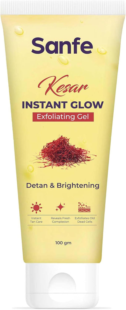 Sanfe Kesar Instant Glow Exfoliating Gel is a gentle yet effective face and body scrub designed to remove dead skin cells, unclog pores, and reveal radiant, glowing skin. Enriched with natural saffron (Kesar) extract, it brightens the skin while promoting smoothness and softness.
