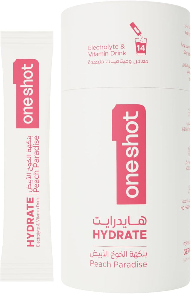 OneShot Hydrate Peach Paradise is a fruity electrolyte hydration mix designed to restore minerals, re-energize the body, and keep you refreshed throughout the day. With a juicy peach flavor, it provides a delicious way to maintain hydration whether during workouts, travel, or daily routines.