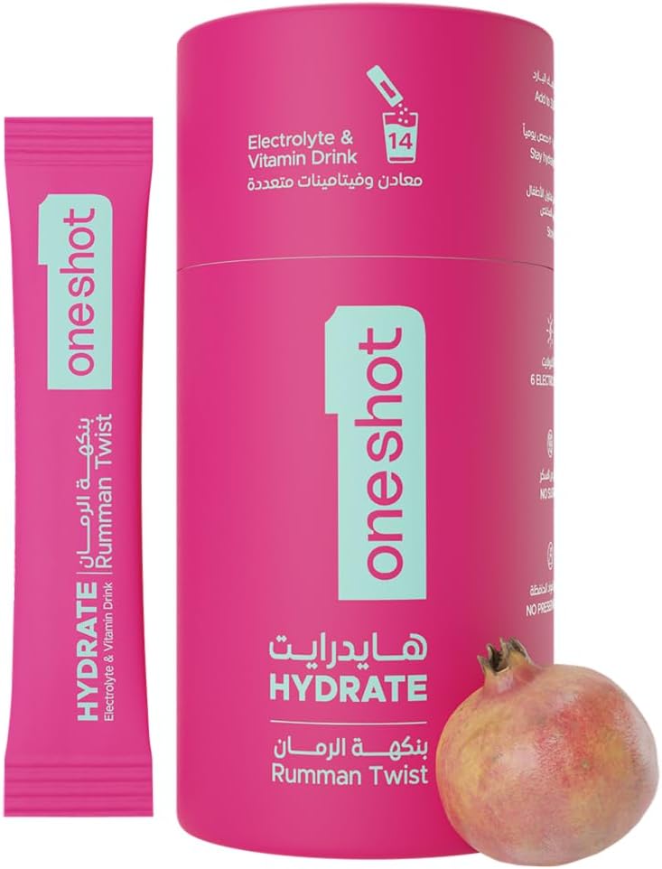 OneShot Hydrate Rumman Twist is a delicious pomegranate-inspired electrolyte hydration mix that helps restore essential minerals, boost energy, and keep you refreshed throughout the day. Convenient and effective, it’s perfect for athletes, travelers, or anyone looking to stay hydrated with a fruity twist.
