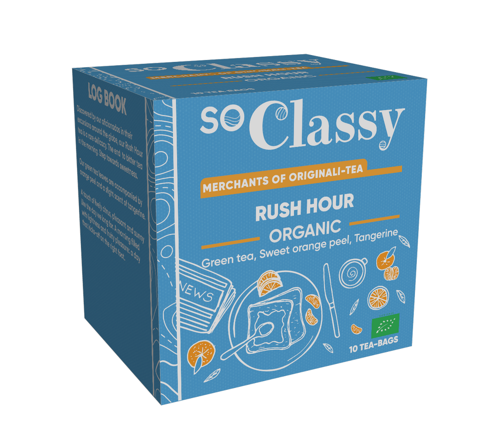 Discovered by So Classy’s aficionados in their excursions around the globe, this Rush Hour tea is a rare delicacy. The end to bitter tea in the morning. Step towards sweetness. The green tea leaves are accompanied by orange peel and a slight scent of tangerine.