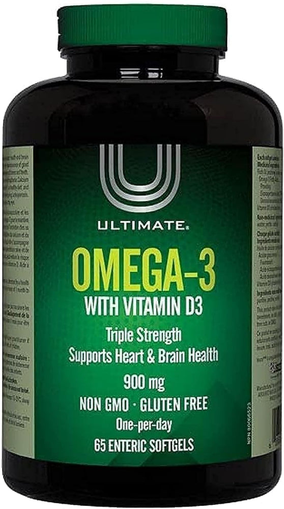 Ultimate Omega-3 900 mg with Vitamin D3 softgels are high-strength dietary supplements designed to support heart, brain, joint, and immune health. Each softgel provides concentrated omega-3 fatty acids (EPA & DHA) combined with Vitamin D3 for better absorption and overall wellness.